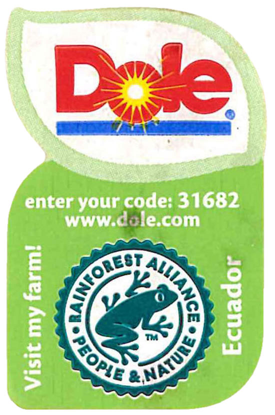 Aufkleber Dole® Ecuador Visit my Farm! Enter Your Code 31682 www.dole.com Rainforest Alliance People & Nature™